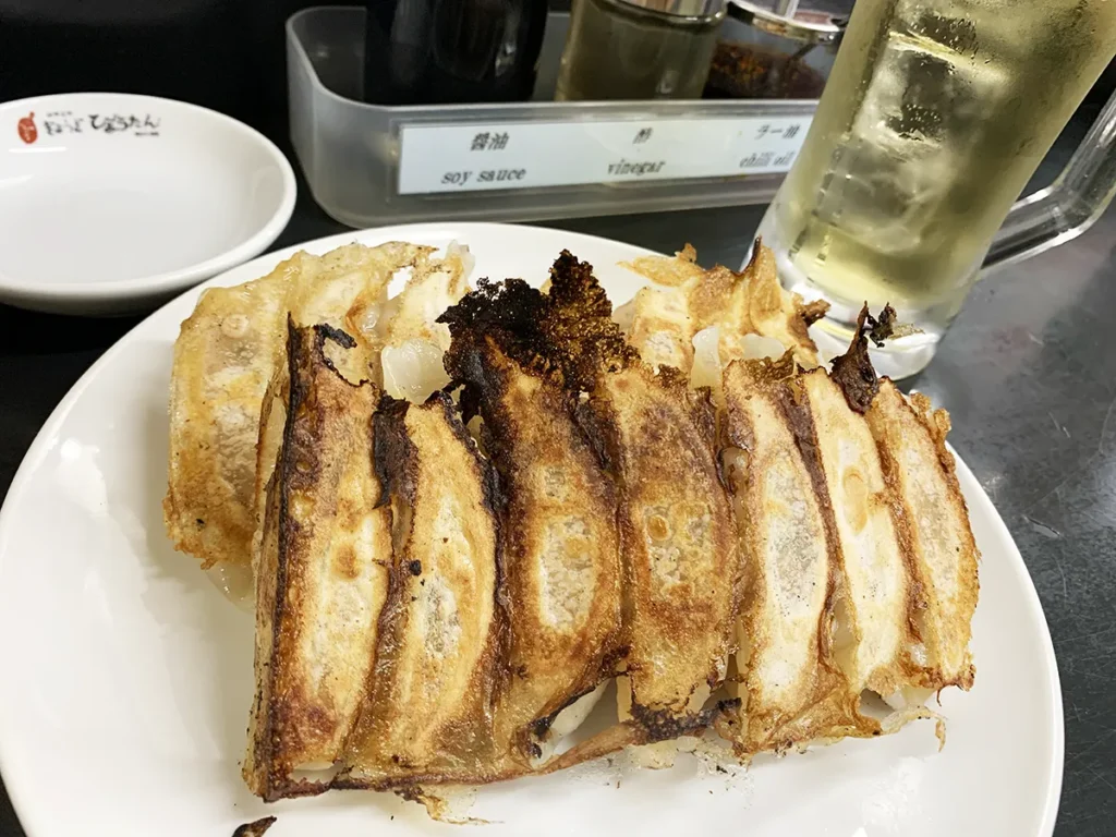 はしご酒の締めに向かったのは、神戸餃子の老舗「ひょうたん」。1957年創業の名店で、神戸っ子なら知らない人はいないと言われるほど有名なお店です。神戸の餃子といえば、赤味噌をベースにした味噌ダレで食べるのが特徴。王道の神戸餃子を体験するなら、やっぱりここは外せません。
