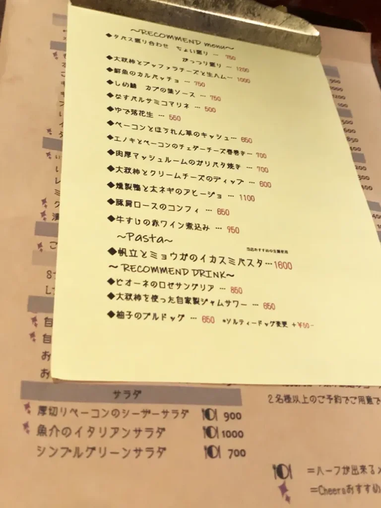 CheersでHオカが注文した飲み物・料理