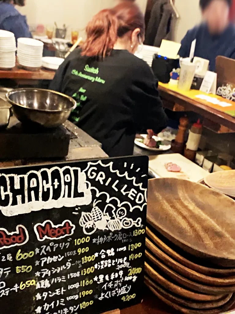 1階は炭火焼の調理を眺めながら飲めるカウンター席が中心。ベンチに腰掛けるセミスタンドスタイルで、ちょい飲みにはちょうどいい距離感です。店内は明るく賑やかで、常連さん同士の会話も自然に生まれるいかにも“バール”な空気。