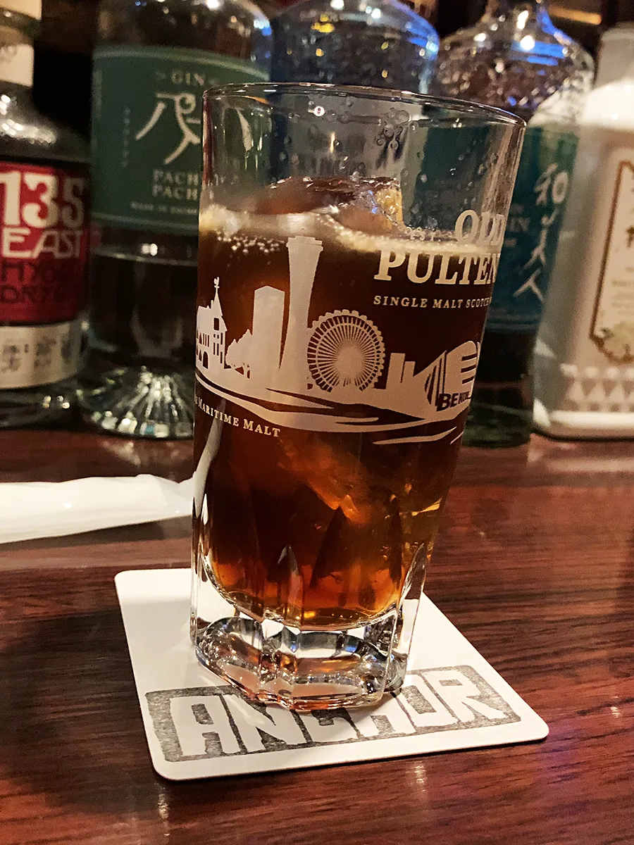 3軒目は、元町駅東口から徒歩2分。地下にひっそりと店を構える「BAR ANCHOR」です。入口はビルの階段を降りた先。ちょっと暗めの階段を下っていくと、なんだか秘密基地に潜入するようなワクワク感があります。はしご酒の途中だと少し足元が怪しくなるので、酔っている人は慎重にどうぞ。