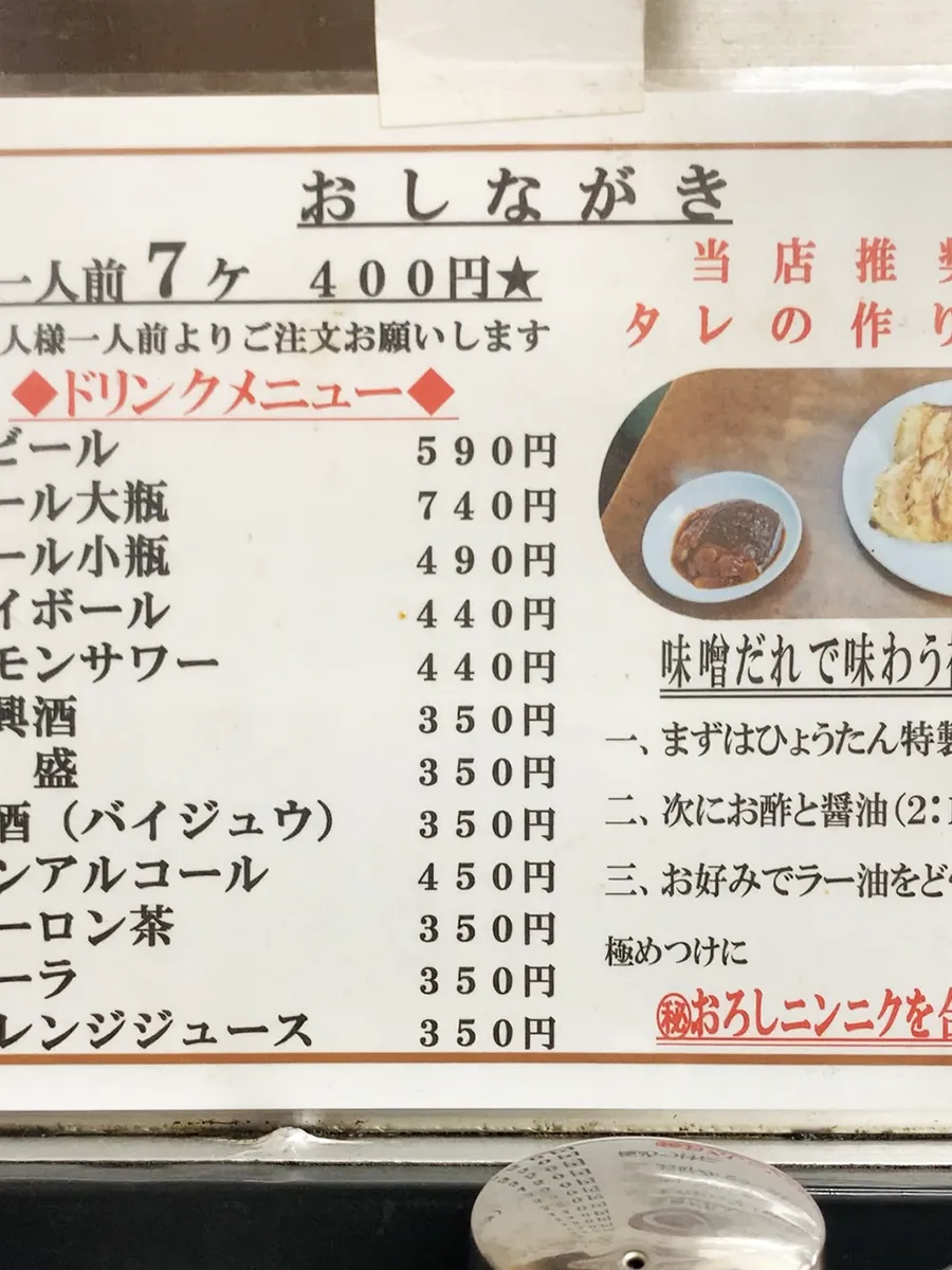 ぎょうざの店 ひょうたん 三宮店でHオカが注文した飲み物・料理